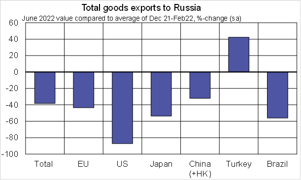 Если посмотреть на поставки товаров в Россию, можно заметить, что Бразилия резко сократила свой экспорт (-57% к среднемесячному за декабрь 2021-февраль 2022).