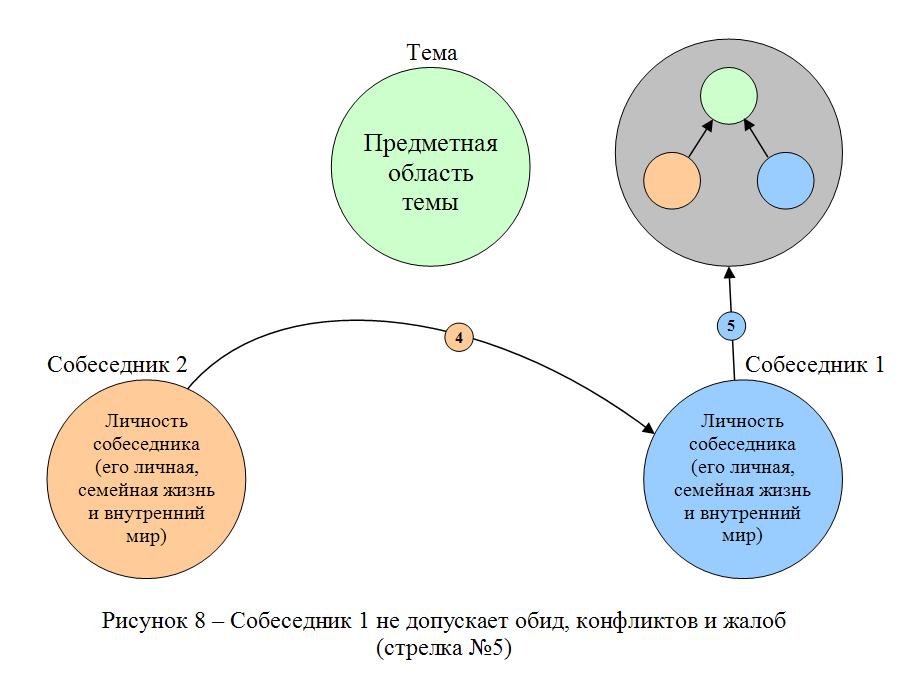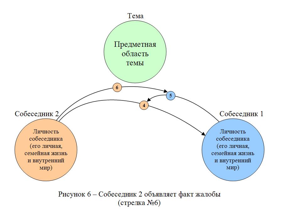 Если же собеседник 2 воспримет объявление факта перехода на личности, как "наезд" на него самого, то он может продолжить противостояние по примеру на рисунке 4. Либо, как более изощрённый вариант, может объявить стрелку №5 на рисунке 5 "фактом непристойной жалобы":