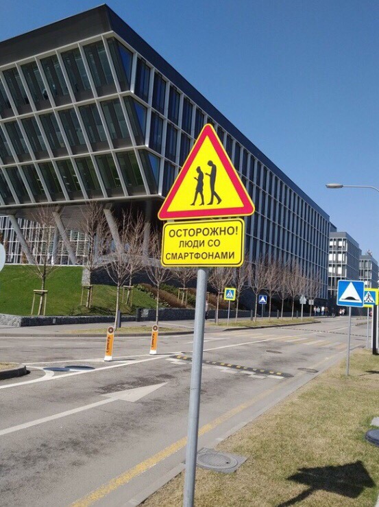 В некоторых местах такие знаки есть. Лично мне кажется что это признак какой-то несознательности в обществе если люди забывают о элементарной безопасности уткнувшись в смартфон. Вспоминается знак "Дикие животные" или "Дети".