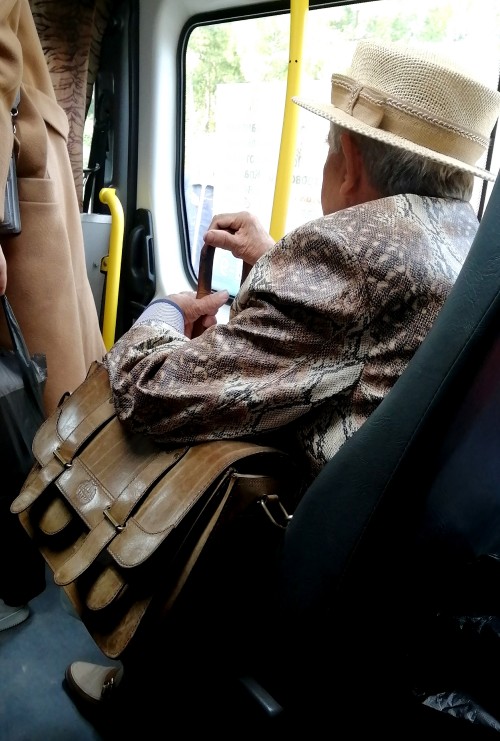 Пиджак под змеиную кожу, добротный кожаный портфель, кожаная обувь..., спереди ретро-рубашка с рюшами, шляпка...., имеенно мужская...